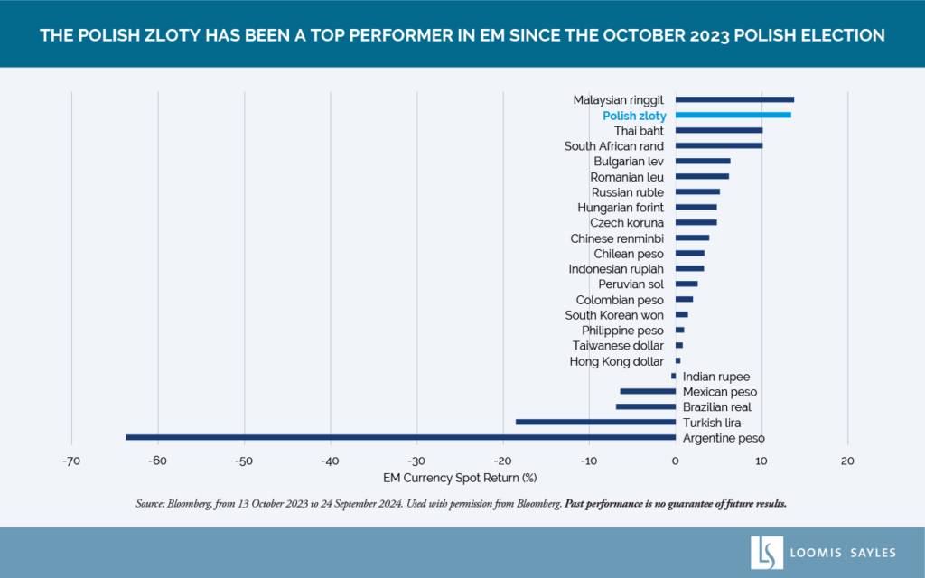 In Poland, the latest election saw the populist PiS party lose its parliamentary majority. While PiS remains the largest individual party, the rise of the center-right Civic Coalition has altered the political landscape. This shift had an immediate market impact, with the market pricing in the European Commission unfreezing ā¬137 billion in EU fundsiiĀ that were previously withheld due to rule-of-law concerns. Polish assets rallied as a result. The Polish zloty in particular has outperformed free-floating CEE FX counterparts by about 800 percentage points in spot return since the October 2023 election.iii The Polish zloty has been one of the best-performing currencies in emerging markets, not only since the election, but year to date in 2024.ivĀ We think these events underscore how political change has the potential to influence investor sentiment, especially in countries heavily dependent on EU funding.